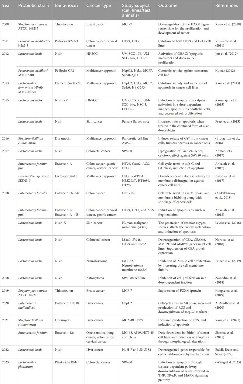 Bacteriocins are cationic peptides that can bind to the negatively charged membrane of cancer cells and act against them . Here we have listed the studies where bacteriocins derived from probiotic bacterial strains were employed against types of cancer.