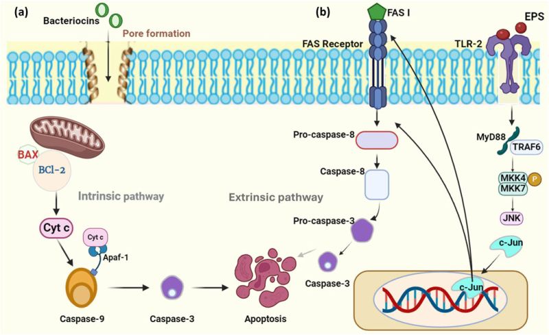 (A) Bacteriocins downregulate the expression of the BCl-2 gene, upregulate the BAX gene, and induce mitochondria to release Cyt c which activates the intrinsic pathway resulting in apoptosis.